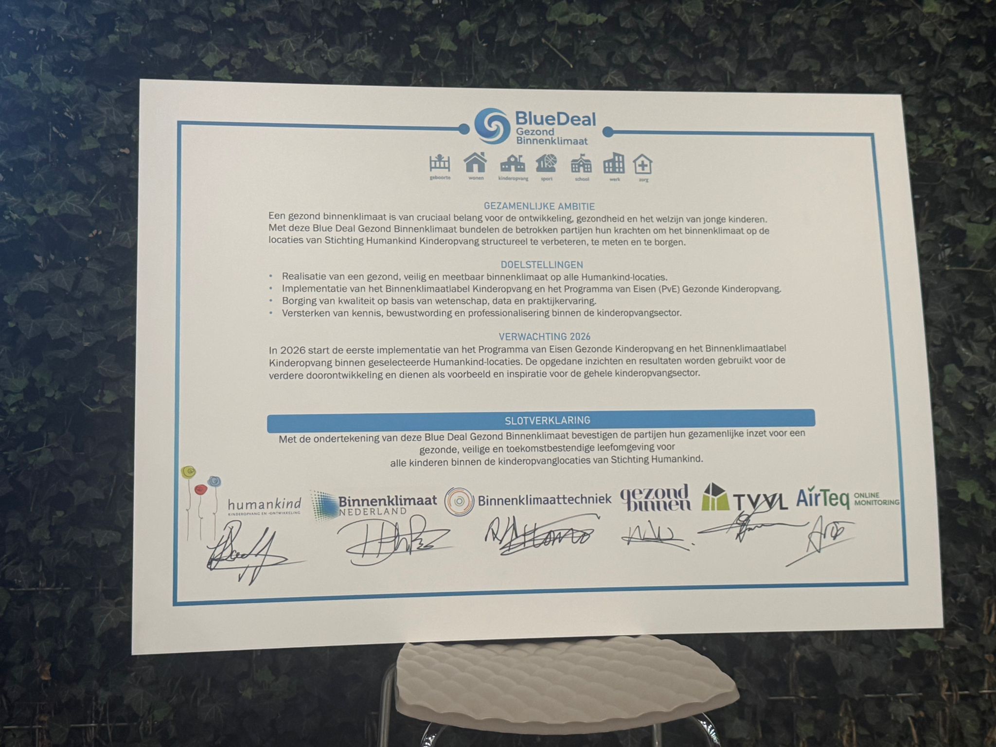 Tijdens de Klimaattop Gebouwde Omgeving is op 6 november de Blue Deal Gezond Binnenklimaat ondertekend – een nationale samenwerking gericht op het verbeteren van het binnenklimaat in kinderopvanglocaties. Humankind Kinderopvang en -ontwikkeling, Binnenklimaat Nederland, TVVL, Stichting Binnenklimaattechniek, Gezond Binnen en AirTeq hebben gezamenlijk hun handtekening gezet onder deze ambitie, waarmee een nieuwe standaard wordt gezet voor gezonde, veilige en toekomstbestendige kinderopvanggebouwen.